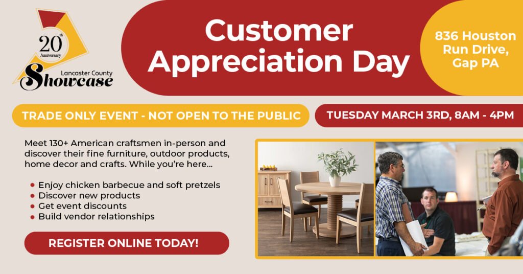 We represent more than 135 craftsmen from Pennsylvania, Ohio, Indiana, Michigan, Virginia, and beyond. Our showroom is open to wholesale buyers (must have a valid sales tax exemption) from 8:00 am – 4:00 pm on normal business days. Buy directly from our showroom or collect catalogs for direct purchases. A 10% brokerage fee is applied to showroom purchases unless you are a Priority Pass member.